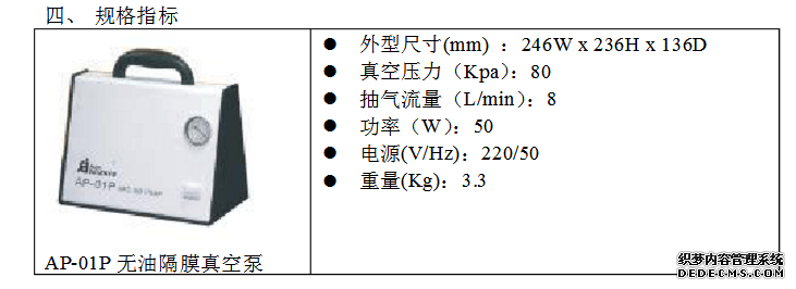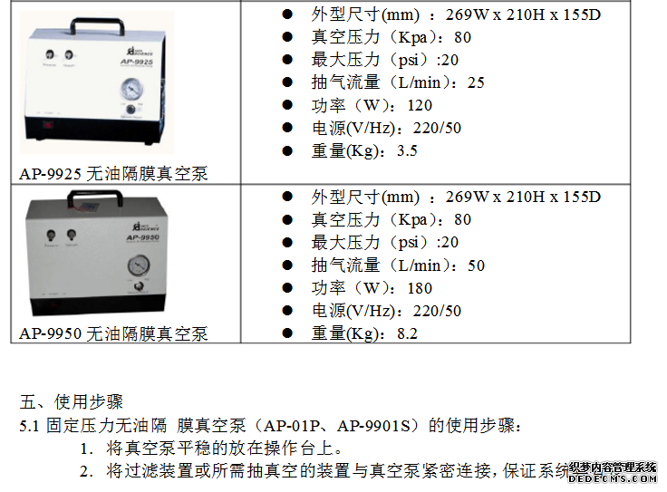 好的氣密性。可在真空泵的進(jìn)氣口和過濾器的出氣口外表涂上酒精等潤滑劑以便于銜接膠管。 5.2可調(diào)壓力無油隔閡真空泵(AP-01D、AP-02B、AP-9925、AP-9950)的運(yùn)用過程: