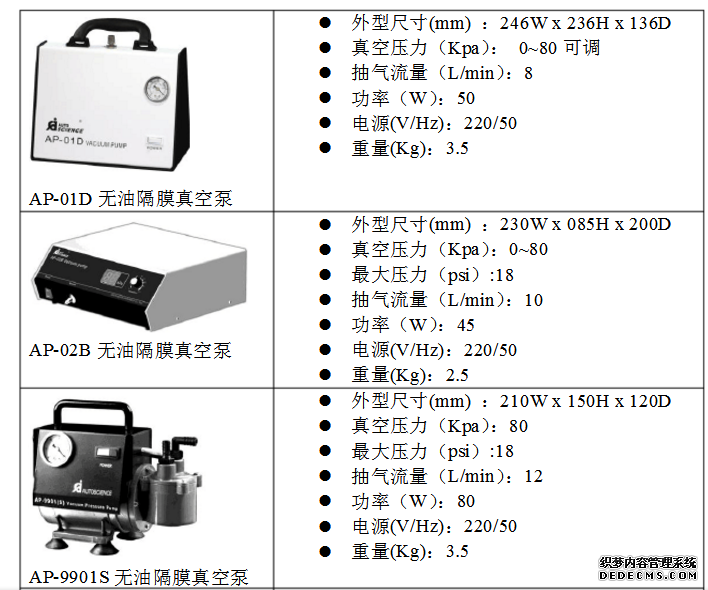 2.為了延伸電機(jī)的運(yùn)用壽命,AP-01P/01D真空泵規(guī)劃有過熱維護(hù)功用。為了確保真空泵正常作業(yè),無油真空泵接連作業(yè)時(shí)間應(yīng)盡量少于30分鐘。如果泵體過熱無法正常作業(yè),封閉電源開關(guān),待電機(jī)溫度降低后,再從頭發(fā)動(dòng)真空泵。