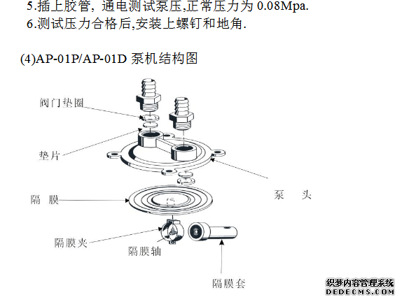 5.插上膠管,通電測驗(yàn)電壓,正常壓力為0.08Mpa. 6.測驗(yàn)壓力合格后,將螺釘涂上膠,固定上泵體底蓋.
